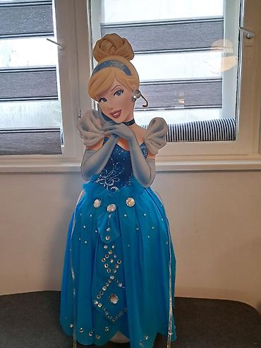 - Donji deo haljine je od plavog krep papira sa ukrasnim trakama i brojnim sjajnim „dijamantićima“/šljokicama i velikim okruglim reflektujućim elementima.