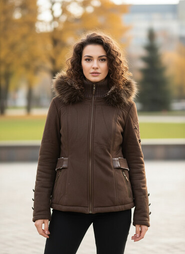 Ženska bunda/kaputić sa kapuljačom – animal print - Elegantna bunda u animal printu (leopard/tigar motiv), u toplim smeđim i nežno ružičastim nijansama - Kroj: ravna linija do kukova, kratki rukav...