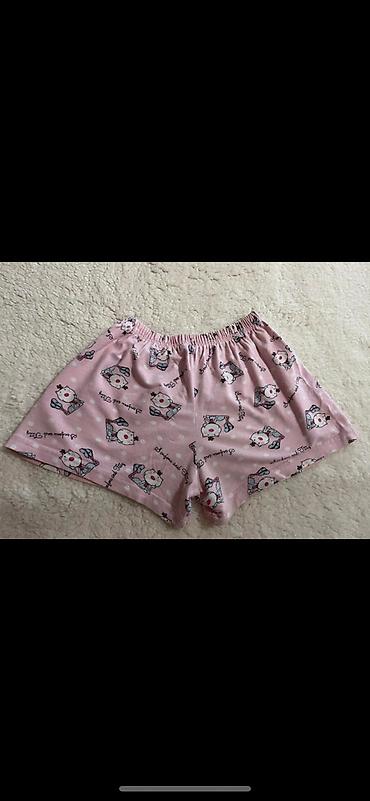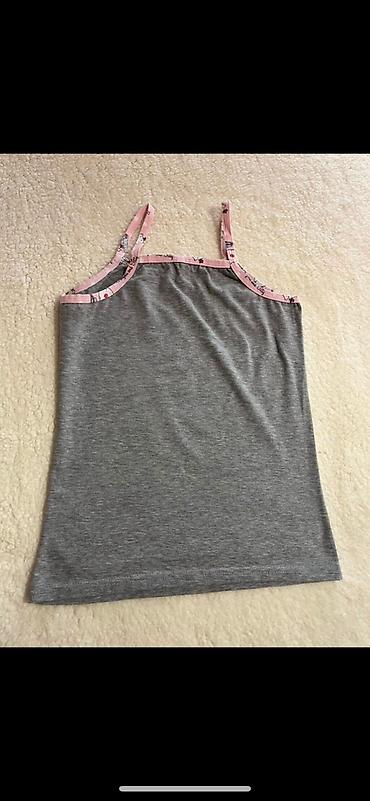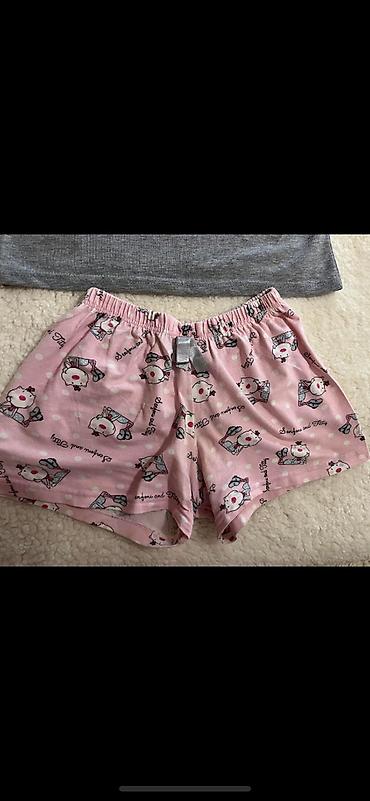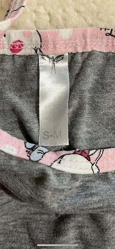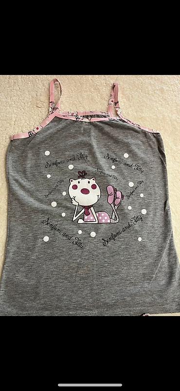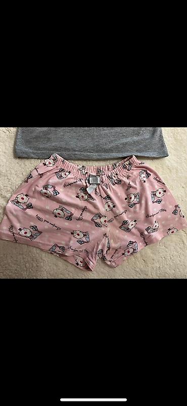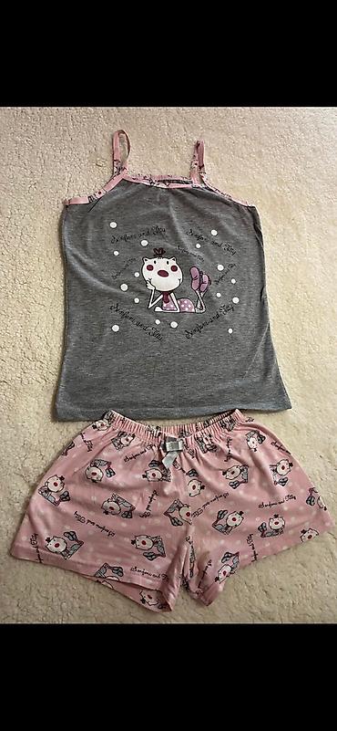 Dvodijelna pidžama set – top na tanke bretele i široke pantalone. Materijal je lagan i mekan, sa sitnim žutim prugama i uzorkom trešanja po celoj površini. Detalji: - Gornji deo: V-izrez, tanke p...