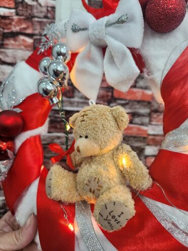 - Dekor: plišani medo “I love you” u donjem delu, crvena satenska mašnica, buket srebrnih kuglica, mat i sjajne crvene kuglice različitih veličina, srebrne grančice sa šljokicama