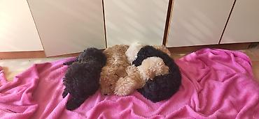 Fotografije prikazuju aktuelno leglo u više boja. 4 decaka i 1 devojcica,otac crvena pudla s rodovnikom,majka belo siva.Očišćeni od parazita.