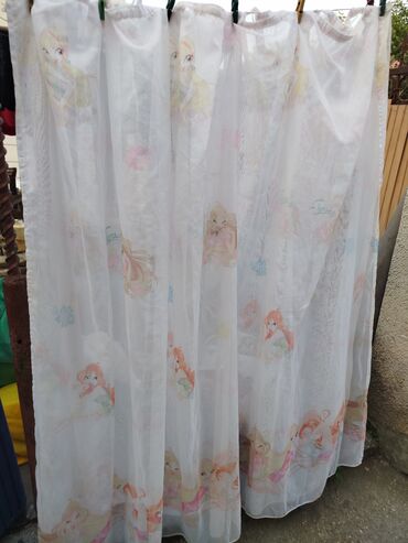 - Svetla, prozračna bela zavesa sa motivima crtanim devojčica/vila u pastelnim bojama.