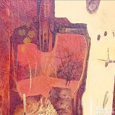 - Tema/stil: apstraktna kompozicija u toplim zemljanim tonovima (crvena, oker, bordo) sa naglašenim vertikalnim belim poljem i akcentima u zeleno-plavim tačkama