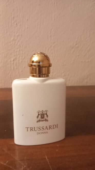 - Elegantna bela bočica sa zlatnim čepom i grbom brenda