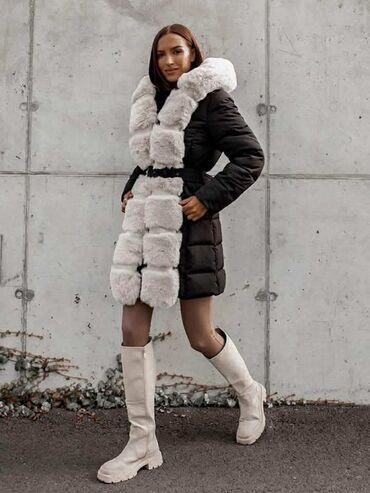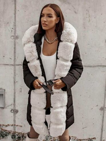 - Boje: telo jakne u crnoj boji; kontrastni krzneni detalji u svetloj/bež nijansi.