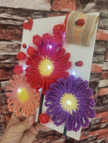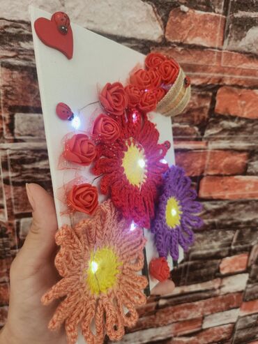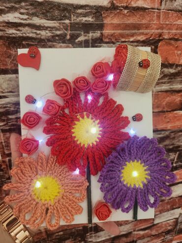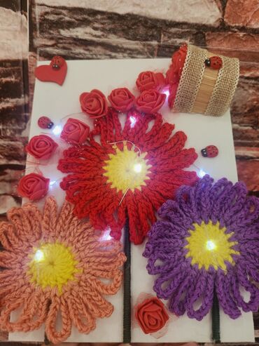 Ručni zidni dekor – platno sa pletenim cvećem i LED osvetljenjem - Osnova: belo platno - Motiv: tri velike ručno heklane cvetne glavice (crvena, ljubičasta i boja breskve) sa žutim centrima i obl...Dogovor
