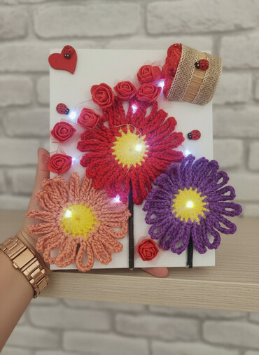 O trošku kupcaRučni zidni dekor – platno sa pletenim cvećem i LED osvetljenjem