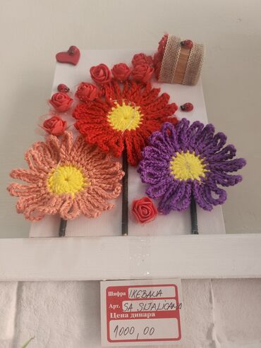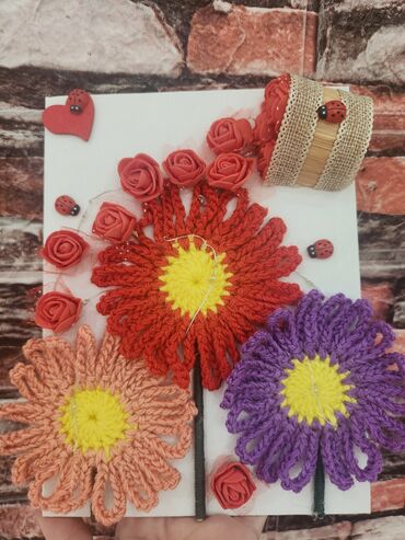 - Motiv: tri velike ručno heklane cvetne glavice (crvena, ljubičasta i boja breskve) sa žutim centrima i obloženim zelenim „stabljikama”